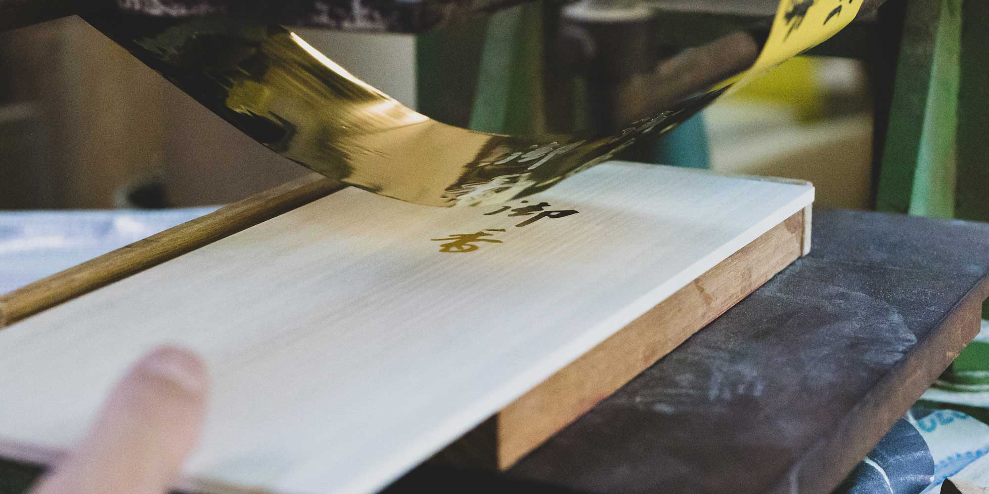 比較的高級な内容物を収める桐箱に使用される印刷技法の一つです。こちらは、印鑑のように版を押し当て、同時に桐箱に着色するもので、印圧によりすこし窪みができるのが特徴です。