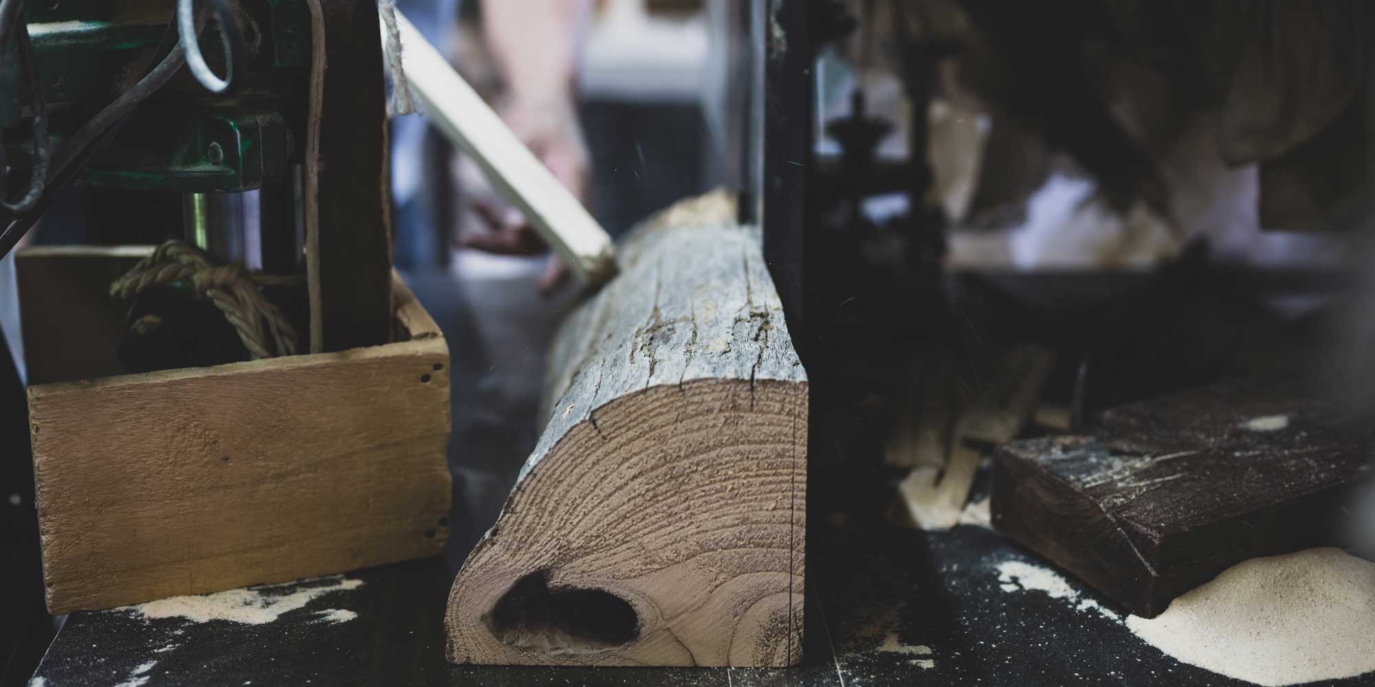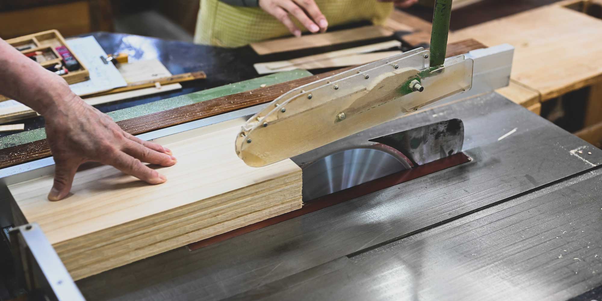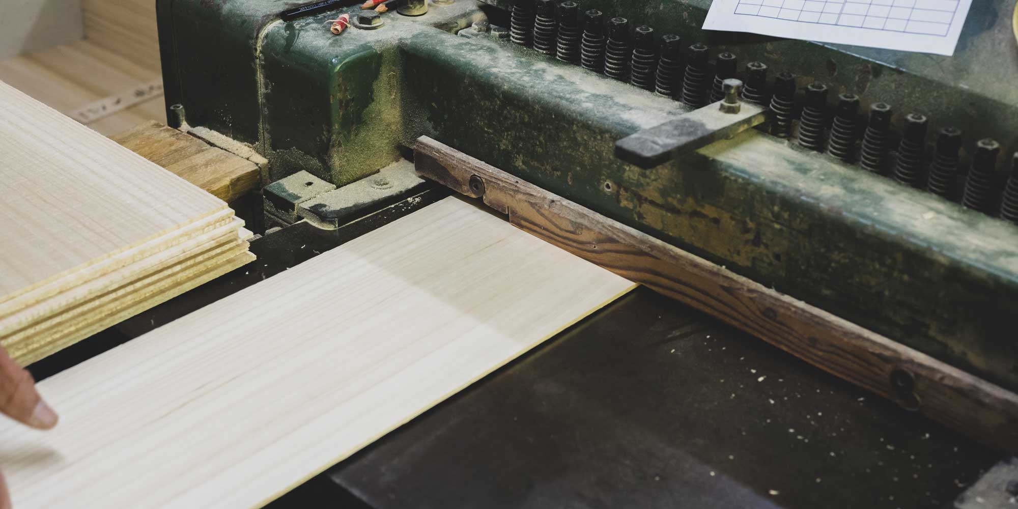 桐材を製品に合わせて、丸太から板状にしていきます。当社の場合は、ベニア素材のものだけではなく、無垢素材の桐材の板を使用する場合自社にて製材を行っています。