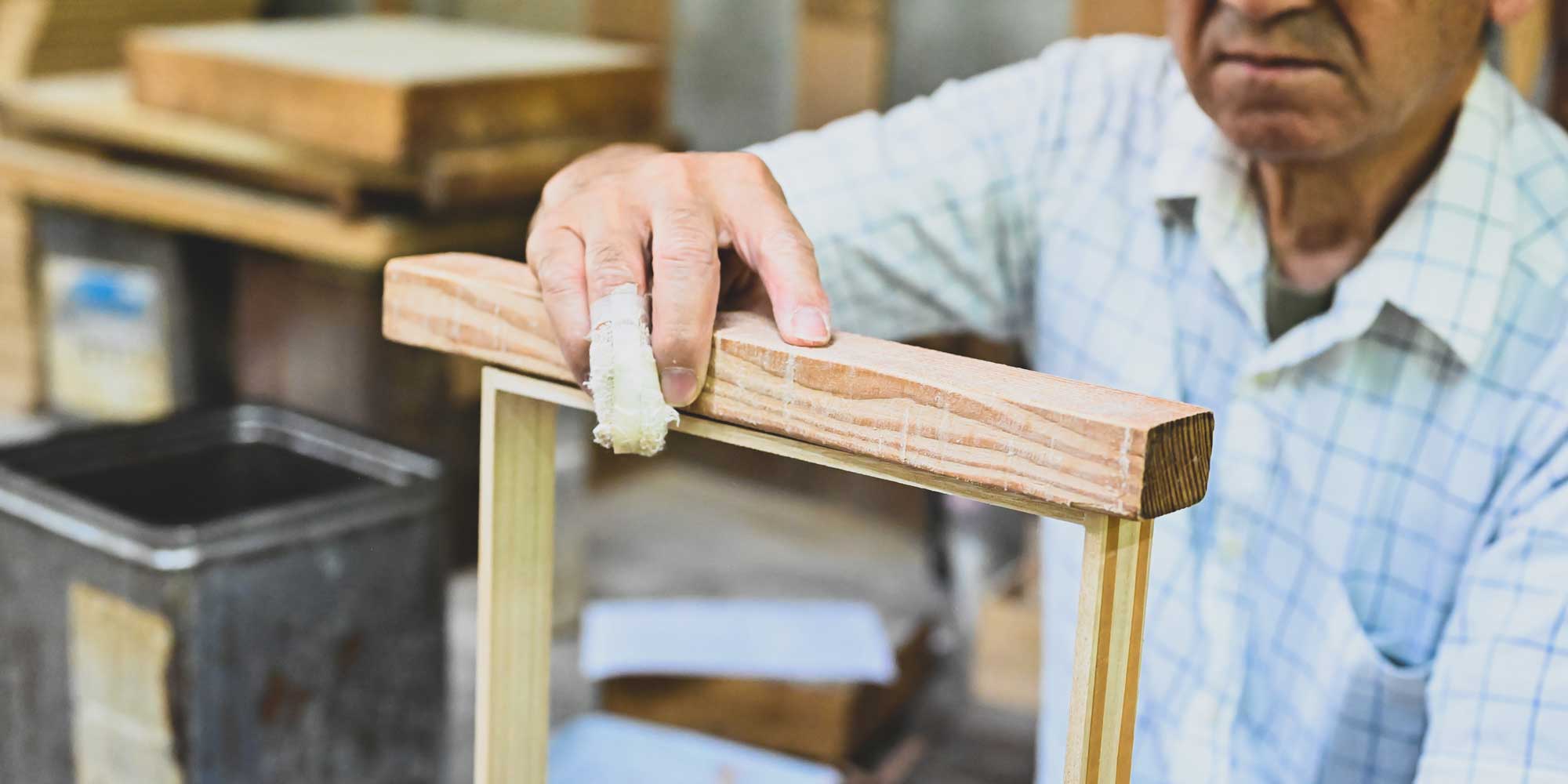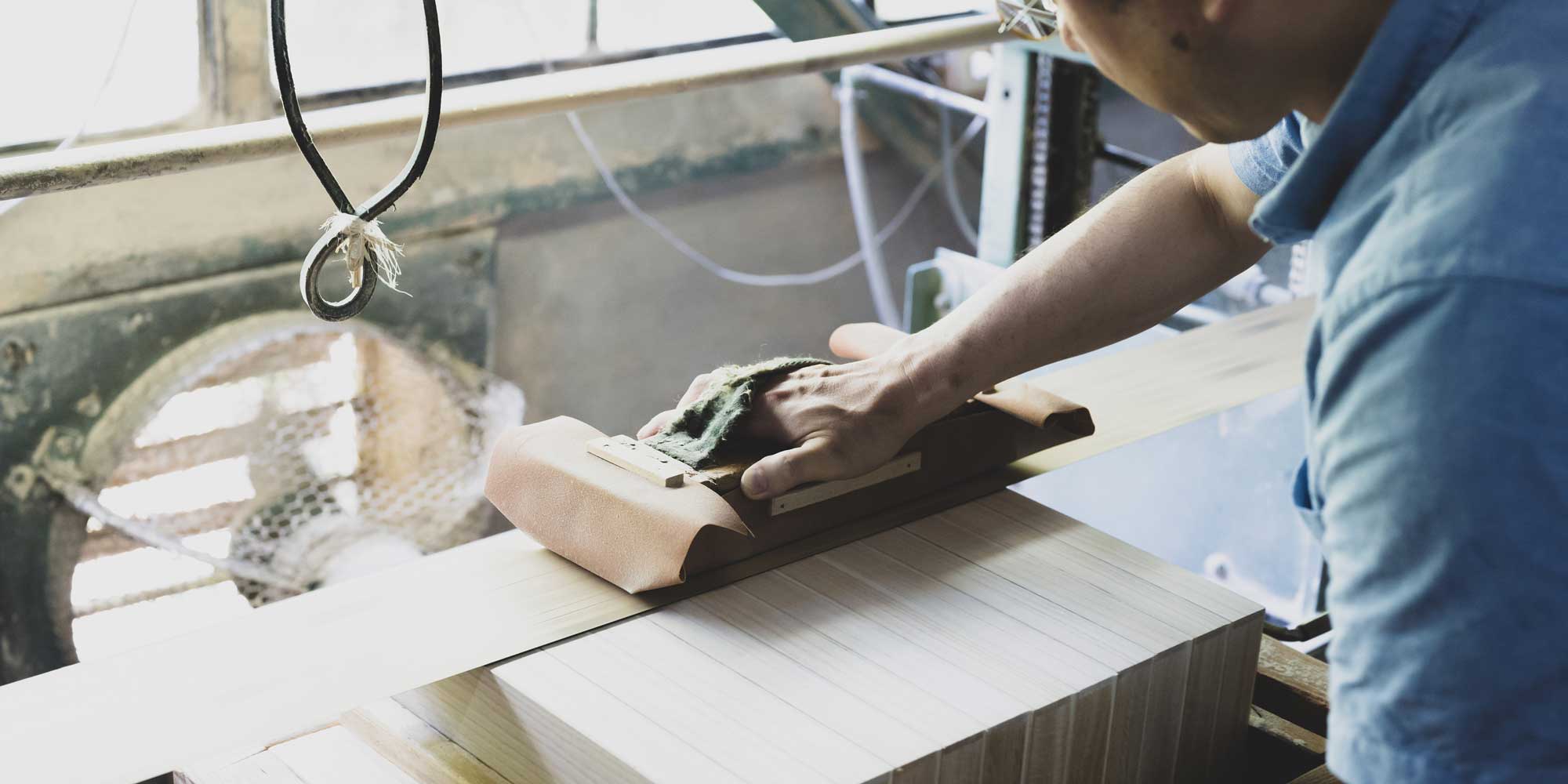 板を接着させた後に、凹凸をなだらかにするためにサンドペーパーをかけます。機械化はされているものの、職人が手を使ってならすことには変わりなく、最終的には職人の感覚で仕上げる工程となります。